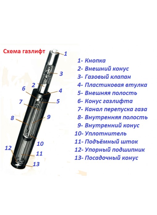 Газпатрон состоит из двух цилиндров: широкий и узкий. Широкий внешний цилиндр вставляется в крестовину кресла, а узкий внутренний в механизм качания или пиастру под сиденьем. Рабочий газ под высоким давлением закачан в узкий цилиндр газлифта и обеспечивает подъем сидения. Высота кресла регулируется с помощью рычага, который расположен под сидением кресла. В широком цилиндре находятся подшипники, с помощью которых кресло может поворачиваться вокруг своей оси.