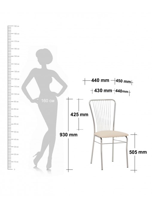 Форма стула классическая, ножки прямые, имеют защитные пластиковые заглушки на концах, которые предотвращают повреждение пола, обеспечивают бесшумность передвижения мебели. Высота стула составляет 93 см со спинкой. Подлокотников у стула нет, высота сиденья стационарная (не изменяется).